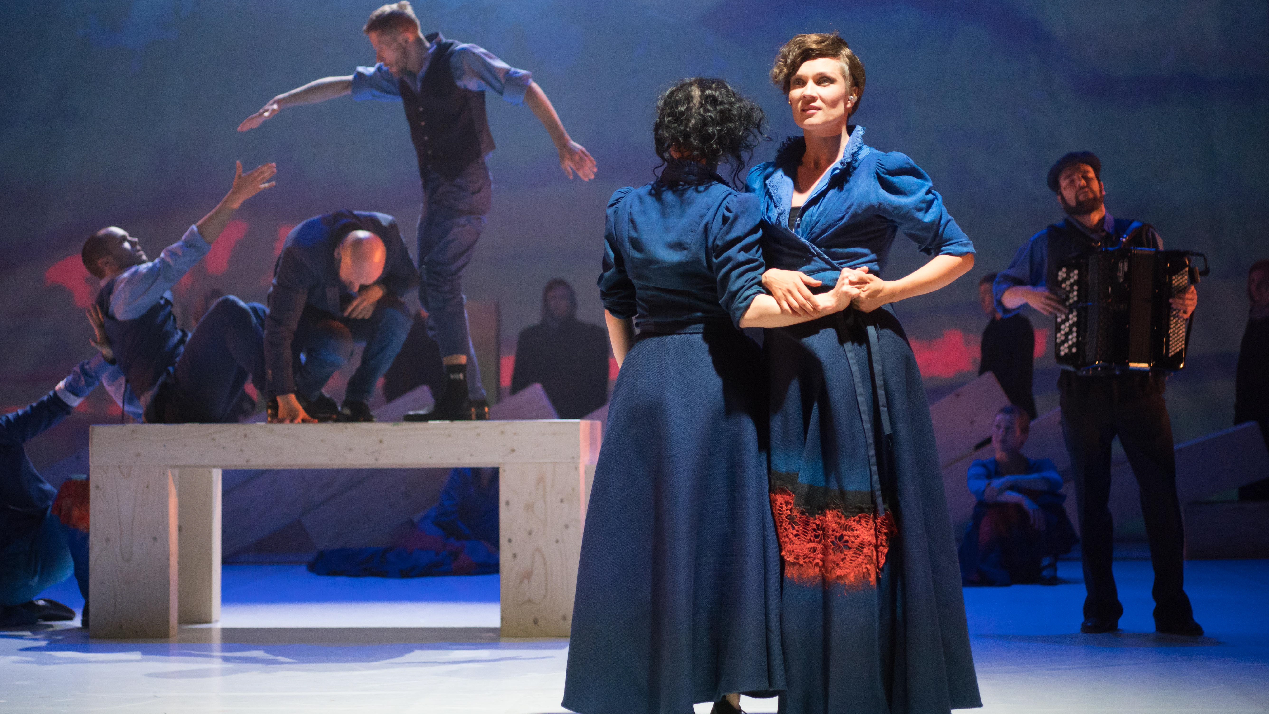 We called her Bertha is a hypnotic stage work performed by two dancers and a double bassist. The work is based on the moving unison of female figures dressed in huge skirts, where bodily metamorphosis transports the viewer in time from youth to old age, from memories to dreams. In the picturesque work, in the hinterland of the mind, hopes become reality, landscapes are distorted, and the passage of time is unpredictable.